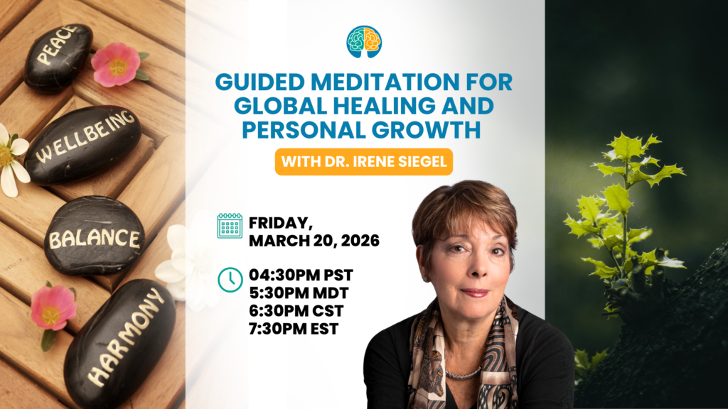 We warmly invite you to take a moment for yourself and join us for a free online gathering: “Guided Meditation for Global Healing and Personal Growth” with Dr. Irene Siegel. In a time when the world can feel heavy with uncertainty and conflict, coming together in shared intention can be deeply meaningful. This meditation offers a space to slow down, reconnect within, and contribute to a wider field of healing that so many people are longing for right now.