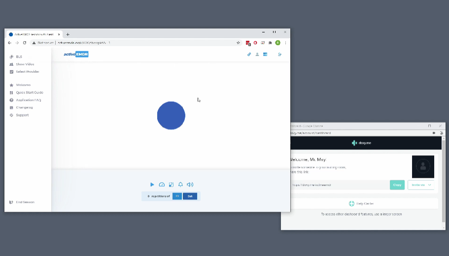 Active EMDR offers a free bilateral stimulation (BLS) tool for EMDR therapists. This web-based application aims to replace your EMDR equipment (no more EMDR light bars!). Active EMDR integrates with popular video-conferencing solutions and runs on your browser, so you don’t have to download any software.